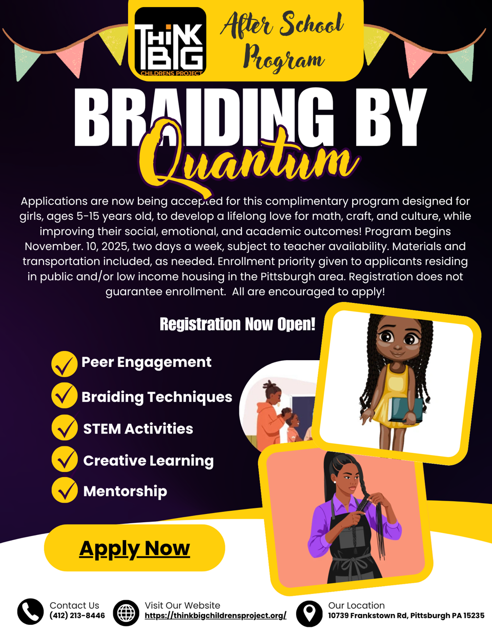 The need for supplemental programs led Valisa to found the Think Big Children’s Project toward closing the gap for children by offering social, emotional, and developmental support. Think Big Children’s Project was created to go a step further for Monroeville, East End, Plum, and Wilkinsburg children. Our programs maximize the benefits of arts, culture and craft to support well being and academic success starting with very young children.